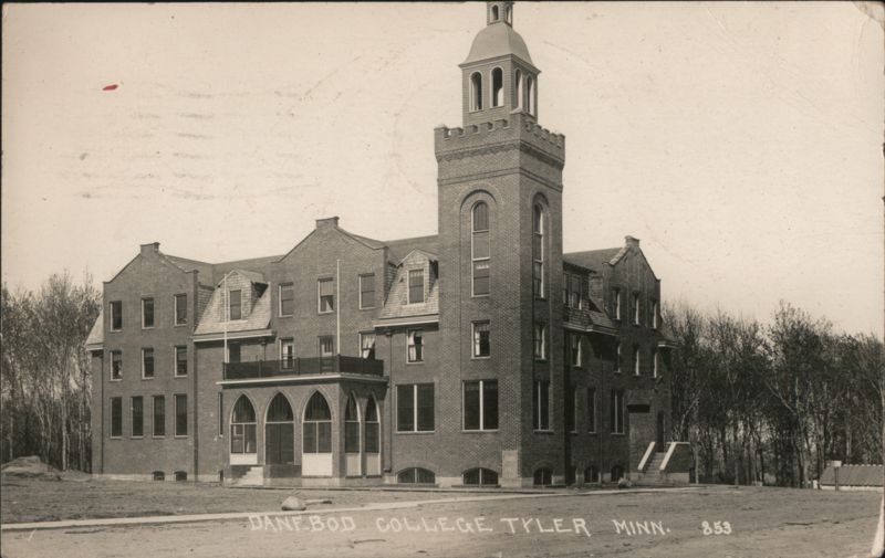 Exterior view of Danebod College, a multi-story brick building featuring a prominent central tower with a cupola, arched windows, and multiple dormers.