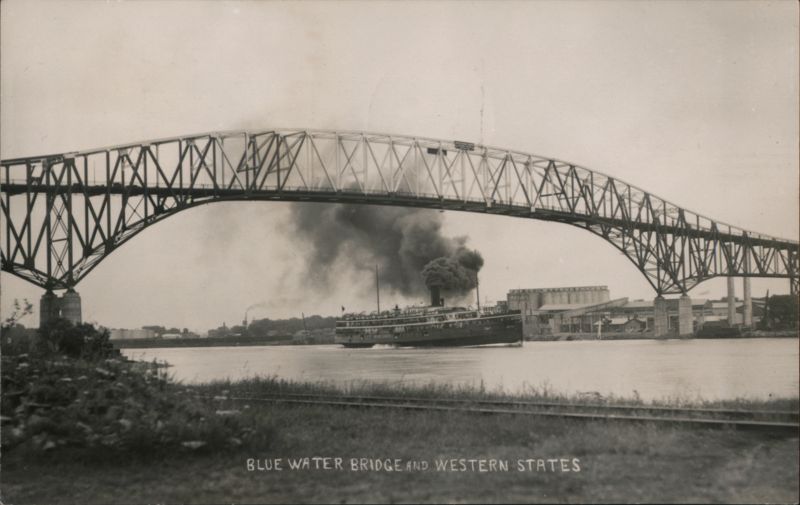 The Western States steamship passes under the Blue Water Bridge, which connects Sarnia, Ontario, and Port Huron, Michigan. Smoke billows from the ship's stack. The reverse side features a 'BLUE WATER BRIDGE OPENING COMMEMORATIVE' imprint and is postmarked in Sarnia, ON, on October 9, 1938, the day before the bridge's official opening. |