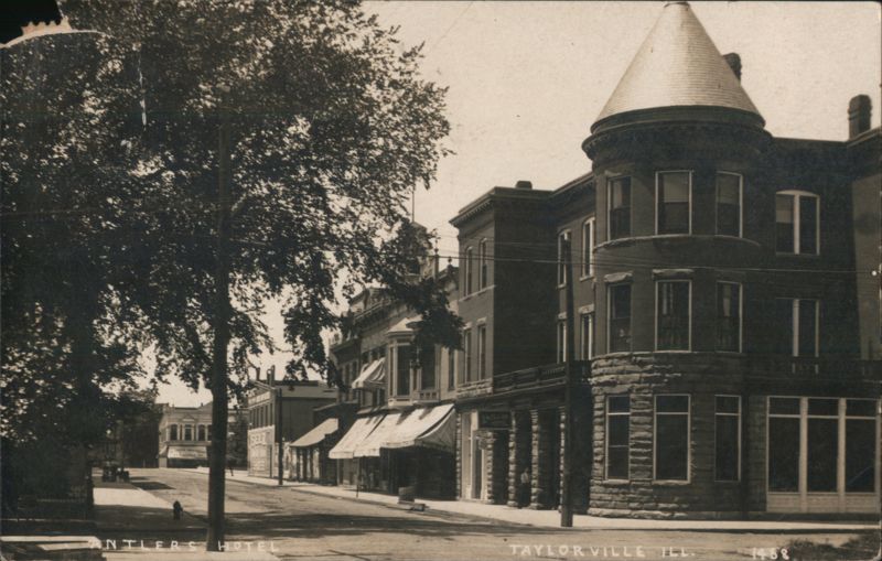 Street view of the Antlers Hotel, featuring a prominent corner turret, alongside other commercial buildings in Taylorville. A large tree is visible in the left foreground.