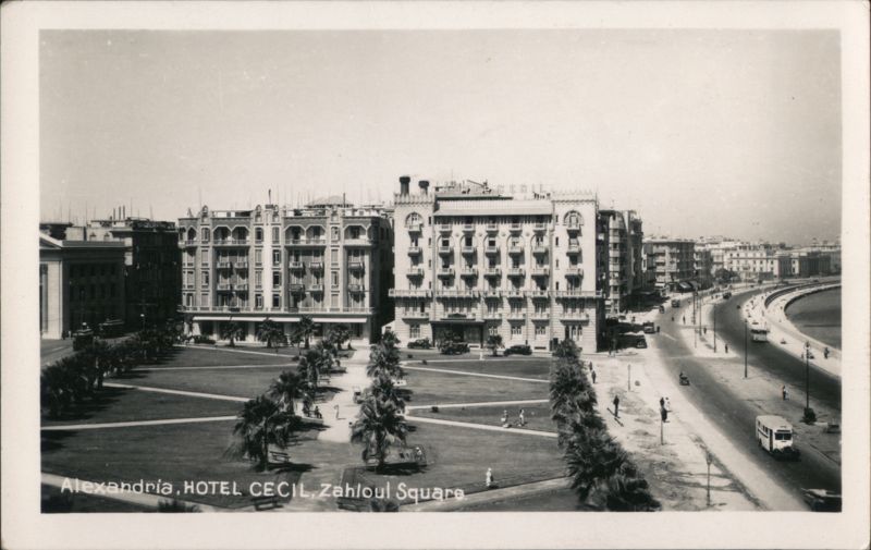 | View of the Hotel Cecil building facing Zahloul Square, which is landscaped with grass and palm trees. Several early 20th-century automobiles and a larger vehicle, possibly a bus or tram, are visible on the street to the right of the square. Other buildings line the background. |
