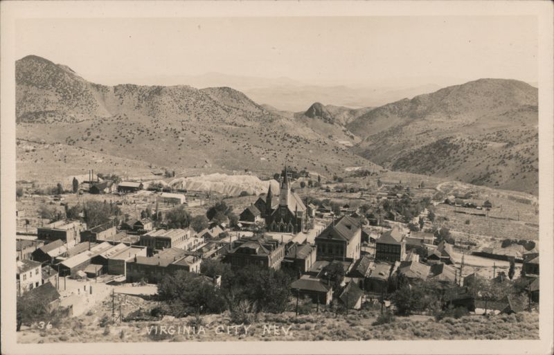 Elevated view of Virginia City, Nevada, nestled in a hilly, arid landscape. A prominent church with a tall steeple is visible in the center of the town. Mine tailings can be seen on the hillside in the background.