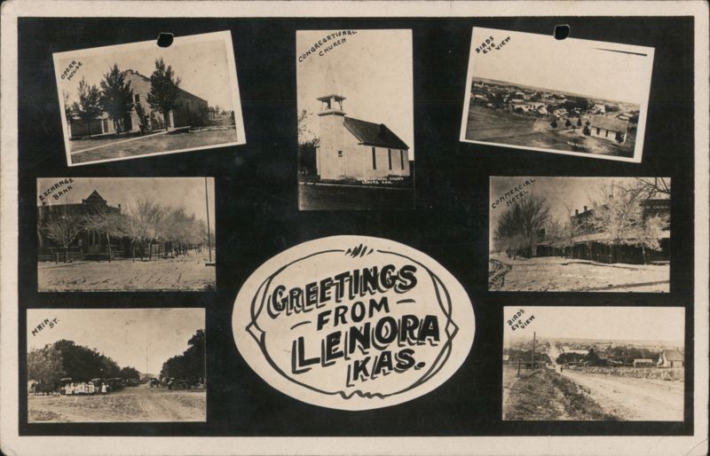 Collage of seven scenes from Lenora, Kansas, including the Opera House, Exchange Bank, Main Street, Congregational Church, two Bird's Eye Views, and the Commercial Hotel.