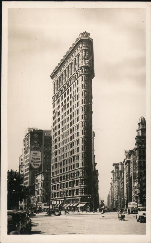 Street view of the Flatiron Building with early 20th-century automobiles and pedestrians. A Sherwin-Williams Paints advertisement is visible on a nearby building.