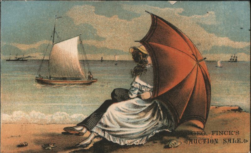 Advertisement for Geo. Finck, Jeweler, for his auction sale at No. 3 Kearny Street, Corner Geary. Offering diamonds, gold and silver watches, fine jewelry, and novelties in quadruple plated silver. Sales daily at 7:30 P.M. J. H. French, Auctioneer. The front features a chromolithograph of a woman in a white dress and hat sitting on a sandy beach under a large red umbrella, looking out at sailboats on the water. Text on front bottom right: "GEO. FINCK'S AUCTION SALE." |