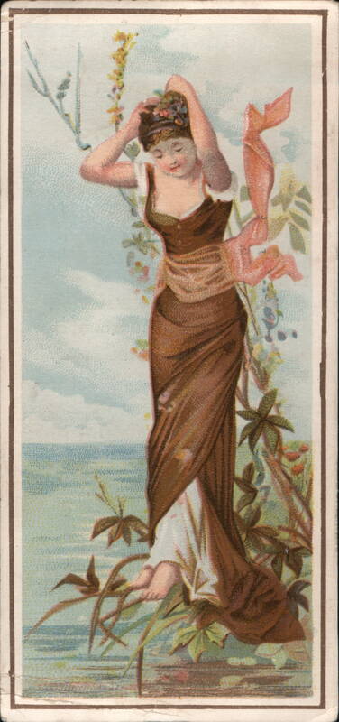 Full-length illustration of a woman in a brown and white dress with a pink sash, standing barefoot outdoors with flowers in her hair. Behind her are plants, a body of water, and a light blue sky with clouds. The reverse advertises Geo. Finck's Jewelry Store at 3 Kearny St., corner of Geary, detailing items like diamonds, watches, jewelry, and silver plated ware. It mentions 'AUCTION EVERY EVENING AT 7:30. J. H. FRENCH, AUCTIONEER.' and offers a 'companion card of this series' for bringing the card to the store. |