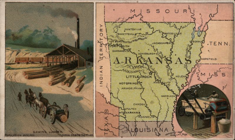 Arkansas Map, Sawing Lumber, Ginning Cotton