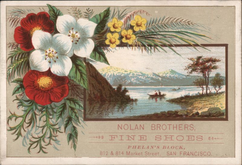 Advertisement for Nolan Brothers Fine Shoes, located at Phelan's Block, 812 & 814 Market Street, San Francisco. The design features a colorful bouquet of red and white flowers with palm fronds on the left, and a framed picturesque scene of a lake with mountains, trees, and two people in a rowboat on the right. |