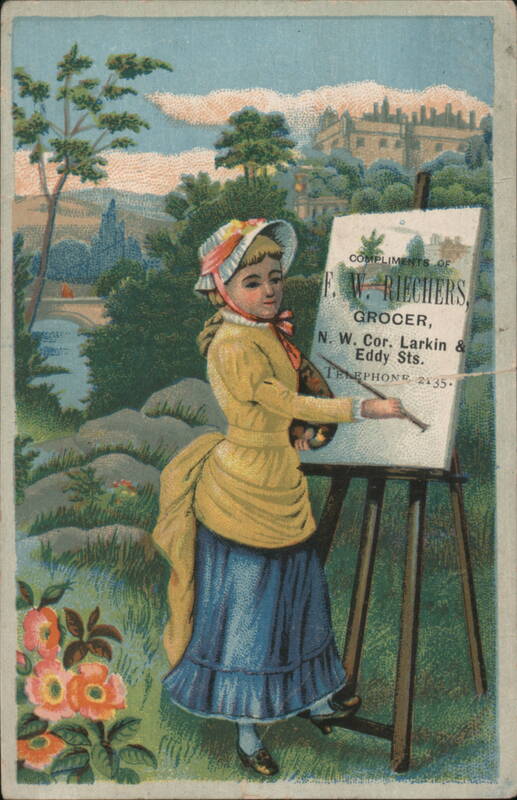 | Illustration of a young girl in a yellow dress and blue skirt, wearing a bonnet, painting an advertisement for F.W. Riechers Grocer on an easel. The background is a pastoral scene with a river, trees, and a distant building. Orange and pink flowers are in the foreground. The easel text reads: "COMPLIMENTS OF F.W. RIECHERS, GROCER, N.W. Cor. LARKIN & Eddy Sts. TELEPHONE 2135." |