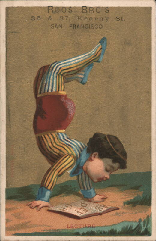 | Advertisement for Roos Bro's Men's, Boy's and Children's Clothing and Gent's Furnishing Goods. Features a boy in a colorful striped suit performing a handstand while reading a book titled 'LECTURE' with 'A B C D E F' visible. Locations: 35 & 37 Kearny St. S. W. cor. Post, San Francisco, CA and Branch House, 22 South C Street, Virginia, NV. |