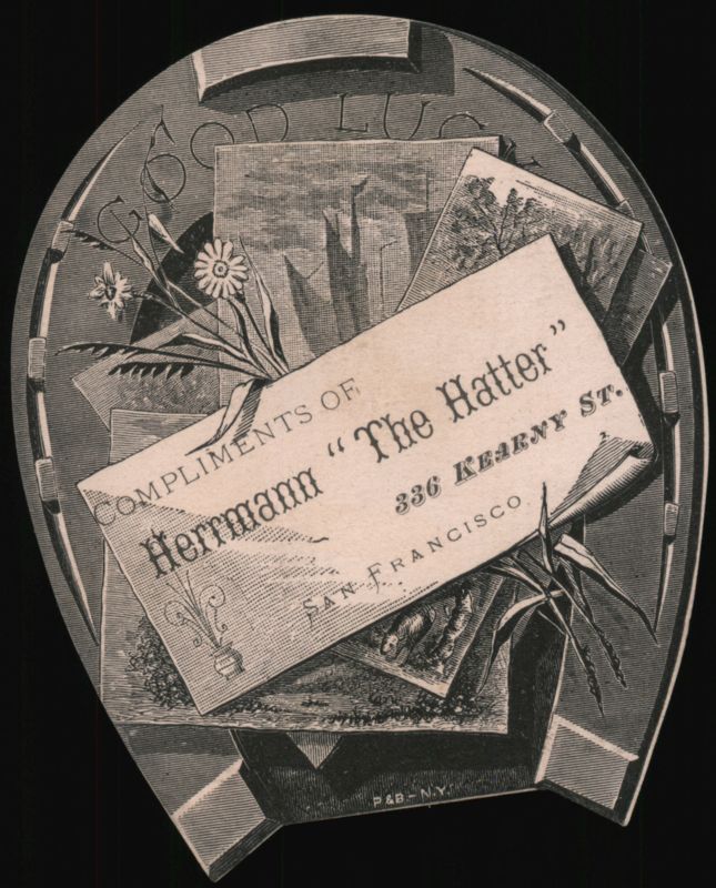 | Die-cut advertising card in the shape of a horseshoe with "GOOD LUCK" lettering on the front. Features floral motifs and small landscape vignettes. Text on the front reads: "COMPLIMENTS OF. Herrmann \"The Hatter\" 336 KEARNY ST. SAN FRANCISCO." The back details: "C. HERRMANN, Importer and Manufacturer of Fine Hats & Caps -AND- DEALER IN HATTERS' MATERIALS, 336 Kearny St., near Pine, Branch: 910 Market Street, FACTORY, 17 Belden St. SAN FRANCISCO." |
