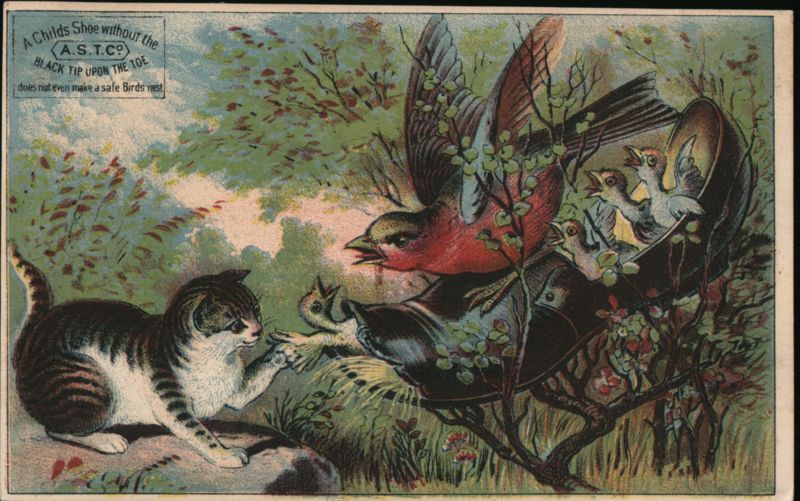 | Illustration for West Brothers' Children's Shoes, featuring a cat trying to reach baby birds in a nest inside a child's shoe. Text on the front states: "A Child's Shoe without the (A.S.T.C.) BLACK TIP UPON THE TOE does not even make a safe Bird's nest". The back advertises: "WEST BROTHERS' Children's Shoes with the A.S.T.C. BLACK TIP ON THEM, They double the value of a Child's Shoe." Sold by Weller & Lancridge, Stockton, California. |