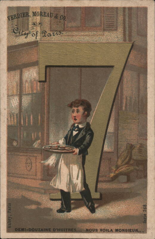 | A young waiter presents a tray of oysters in front of a large number 7. Text at bottom reads "DEMI-DOUZAINE D'HUITRES... NOUS VOILA MONSIEUR." This trade card advertises Verdier, Moreau & Co., Importers & Dealers in Dry Goods, with locations in Paris (5, Rue du Conservatoire), New York (62 et 64, Greene St), and San Francisco (Corner of Montgomery & Sutter Occidental Block). "City of Paris" is prominently featured. |