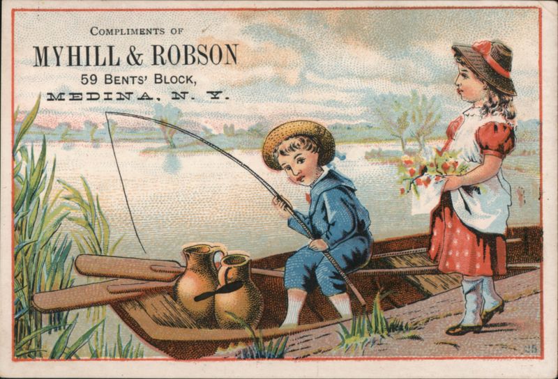 | A young boy in a blue sailor suit and straw hat is fishing from a wooden rowboat. Two brown jugs are in the boat next to him. On the shore, a young girl in a red and white dress and hat stands holding a bouquet of flowers and a white cloth. The text at the top reads: "COMPLIMENTS OF MYHILL & ROBSON, 59 BENTS' BLOCK, MEDINA, N. Y." |