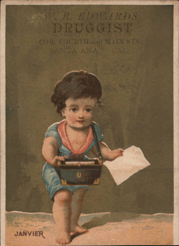| Color illustration on an advertisement for W. R. Edwards, Druggist, located at the corner of Fourth and Main Streets in Santa Ana, California. Depicts a barefoot young child in a blue and orange outfit, carrying a dark satchel-style bag and a piece of paper. Signed 'JANVIER' at the bottom left. |