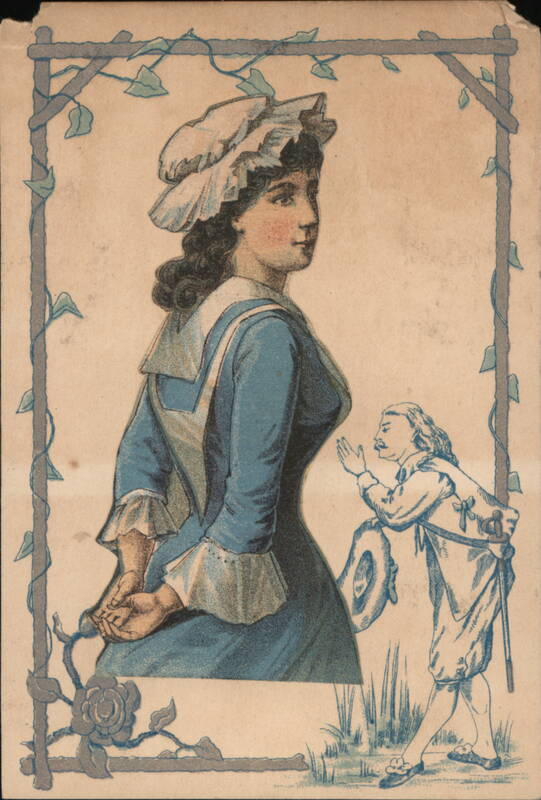 Illustration features a woman in a blue dress with a white collar and cuffs, and a white bonnet. Her dark hair is curled, and her hands are clasped behind her back as she looks off to her right. A much smaller man, dressed in a light-colored period costume with a sash, sword, and buckled shoes, stands to her right and slightly behind, bowing towards her and holding his hat in his left hand, his right hand raised in a gesture of address or admiration. The scene is framed by a blue border with intertwining vines, and a blue rose is depicted at the bottom left corner. The background is a light, mottled beige. |