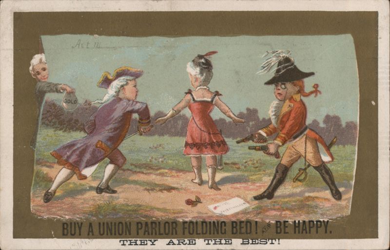Front depicts a colorful theatrical scene labeled 'Act III,' featuring a man with a bag of 'GOLD' hiding, a young girl, and a colonial-era soldier holding two pistols. Text encourages: 'BUY A UNION PARLOR FOLDING BED! BE HAPPY. THEY ARE THE BEST!'. Reverse advertises 'TRUMAN S. CLARK & SON, SOLE AGENTS AND MANUFACTURERS OF Union Parlor Folding Beds, MOST POPULAR BED IN USE. ALSO, WOVEN WIRE MATTRESSES, Clark's Popular Patent Tubular Iron Bedsteads. PILLOW SHAM HOLDERS.' with an address: 'Office and Salesroom, 21 New Montgomery Street SAN FRANCISCO, CA.' |