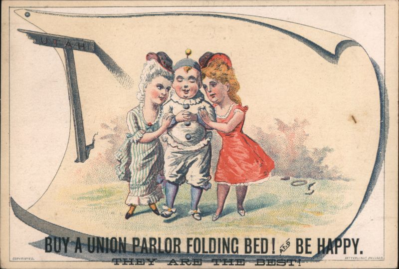 Advertisement for Union Parlor Folding Beds from Truman S. Clark & Son of San Francisco, CA. The front features an illustration of a plump, whimsical central figure with a yellow knob on its head, embraced by two girls in period attire. Slogan: "BUY A UNION PARLOR FOLDING BED! BE HAPPY. THEY ARE THE BEST!". A signpost in the background has "SUTAH" partially visible. The reverse details "TRUMAN S. CLARK & SON, SOLE AGENTS AND MANUFACTURERS OF Union Parlor Folding Beds, MOST POPULAR BED IN USE. ALSO, WOVEN WIRE MATTRESSES, Clark's Popular Patent Tubular Iron Bedsteads. PILLOW SHAM HOLDERS. Office and Salesroom, 21 New Montgomery Street SAN FRANCISCO, CAL." |
