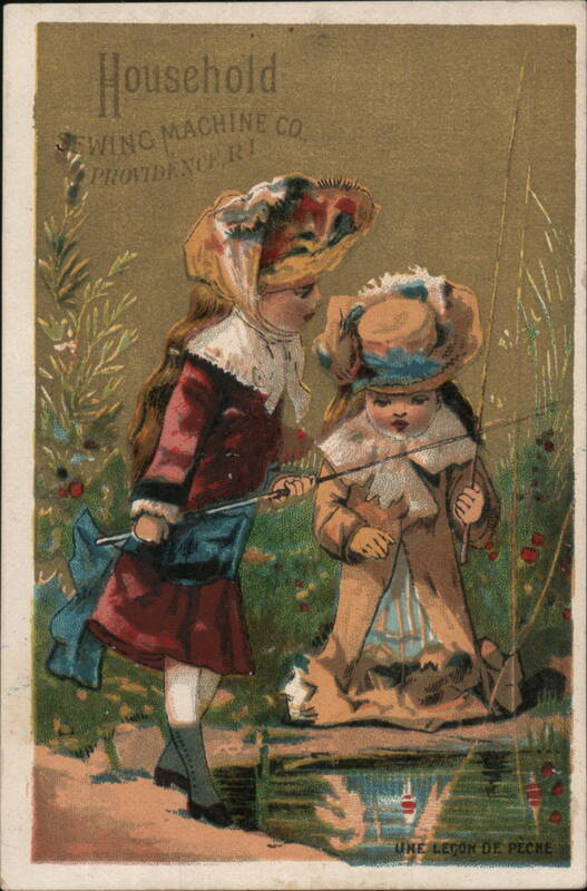 | Chromolithograph titled 'Une Leçon de Pêche' (A Fishing Lesson) depicts two young girls in period clothing fishing by a stream. The reverse advertises the 'Household' Sewing Machine from the Household Sewing Machine Co., Providence, RI, detailing its features and quality. |