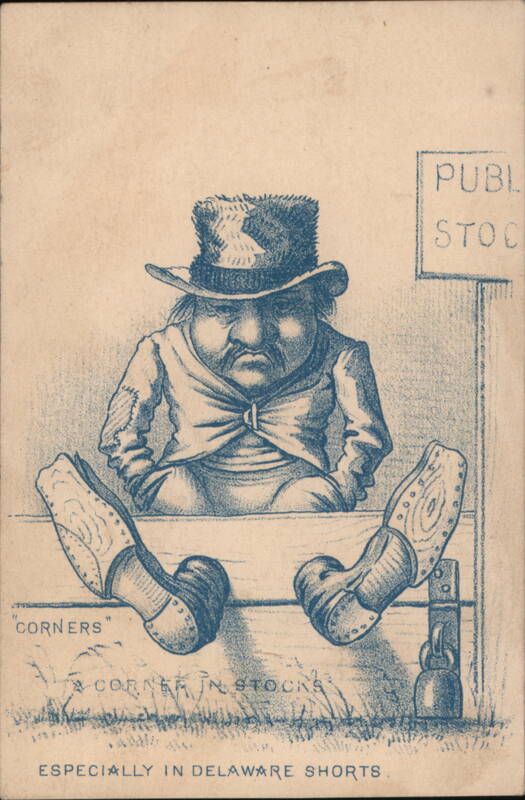 | Caricature of a displeased, portly man wearing a fur hat and a bow tie, seated in public stocks. The wooden stocks are inscribed with "'CORNERS'" and 'A CORNER IN STOCKS.' A nearby sign reads 'PUBL / STOC'. Below, text states: 'ESPECIALLY IN DELAWARE SHORTS.' The illustration is rendered in blue on tan paper. |