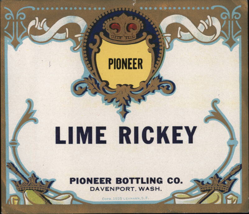 Product label for Pioneer Lime Rickey soda, featuring an ornate design with a central shield topped by a crown and the brand name "PIONEER". Text reads "PIONEER BOTTLING CO. DAVENPORT, WASH.". Copyright 1935 Lehmann, S.F.