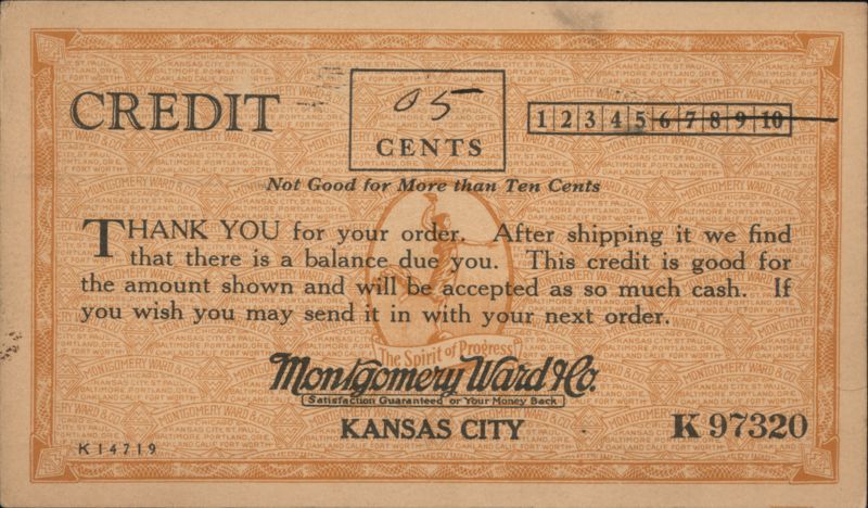 Credit slip for five cents from Montgomery Ward & Co., Kansas City, featuring 'The Spirit of Progress' emblem and 'Satisfaction Guaranteed or Your Money Back'. The text reads: 'THANK YOU for your order. After shipping it we find that there is a balance due you. This credit is good for the amount shown and will be accepted as so much cash. If you wish you may send it in with your next order.' It also states 'Not Good for more than Ten Cents'. The background has a repeating pattern of city names associated with Montgomery Ward. The reverse is addressed to W.H. Taylor, Box 354, Palmyra, Nebr., and postmarked Kansas City, MO, Apr 4 2 PM 1929, with a 1-cent Jefferson stamp. |