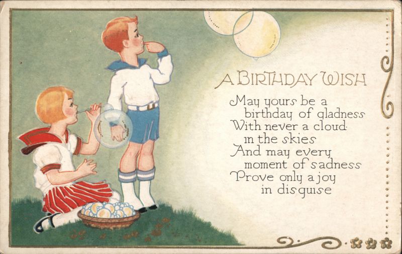 | An illustration depicts a young girl in a sailor-style dress sitting and blowing bubbles from a wand, with a bowl of bubble solution beside her. A boy, also in sailor attire, stands watching, his finger near his mouth. Floating bubbles are visible above them. The card includes the birthday poem: 'May yours be a birthday of gladness With never a cloud in the skies And may every moment of sadness Prove only a joy in disguise'. |