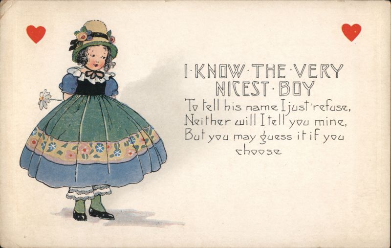 Illustration of a young girl in a blue and green dress with a floral hat, holding a flower behind her back. Two red hearts are in the upper corners. Text reads: 'I KNOW THE VERY NICEST BOY To tell his name I just refuse, Neither will I tell you mine, But you may guess it if you choose'. |
