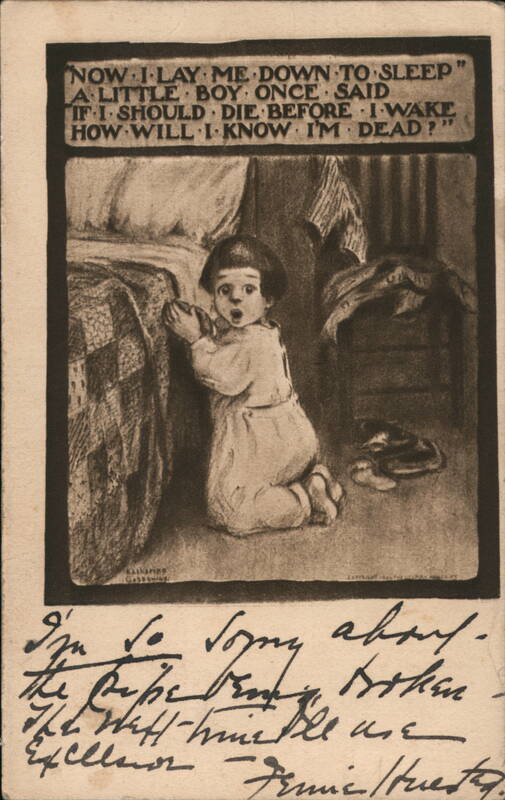 Illustration of a young child in a light-colored nightgown, kneeling beside a bed with a checkered blanket. Text above reads: "NOW I LAY ME DOWN TO SLEEP A LITTLE BOY ONCE SAID IF I SHOULD DIE BEFORE I WAKE HOW WILL I KNOW I'M DEAD?"