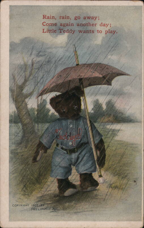 Illustration of a teddy bear in a baseball uniform with "Teddy" written on the front, holding an umbrella and a baseball bat, standing in the rain. A rhyme in the upper right corner reads: "Rain, rain, go away; Come again another day; Little Teddy wants to play." |