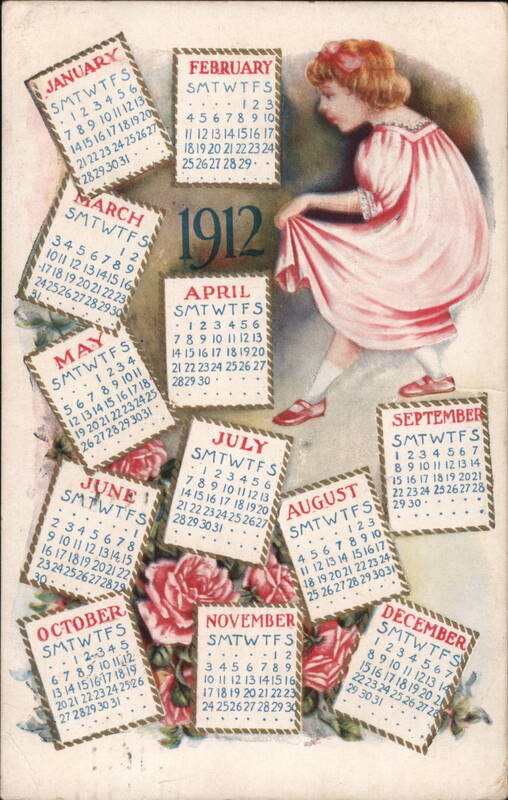 Postcard featuring a full calendar for the year 1912, with each month displayed separately. A young girl in a pink and white dress is depicted on the right side, amongst pink roses.