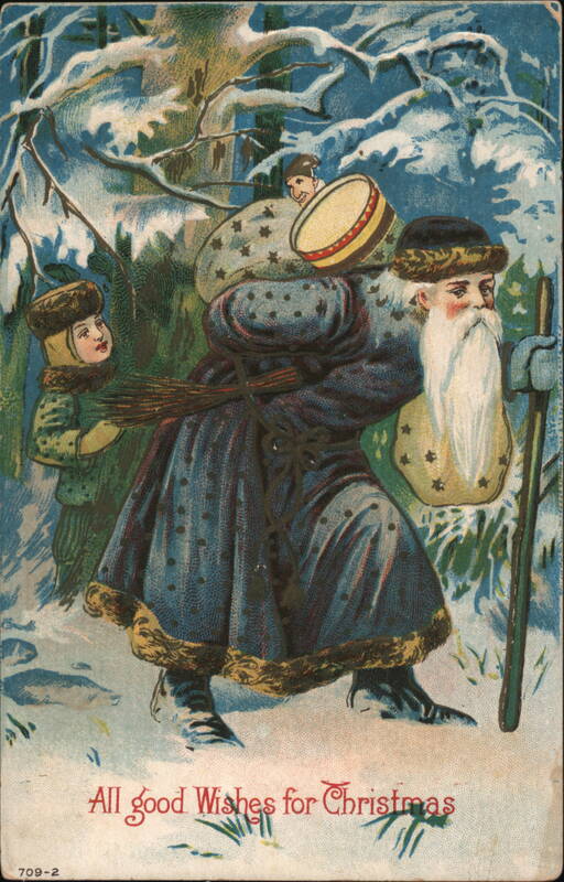 | Illustration of Santa Claus with a long white beard, in a blue, star-patterned, fur-trimmed coat and hat, walking through a snowy forest. He carries a large sack with a visible drum and other gifts on his back, a bundle of sticks under his arm, and holds a staff. A small child in winter attire is depicted to his left. "All good Wishes for Christmas" is printed in red at the bottom. |