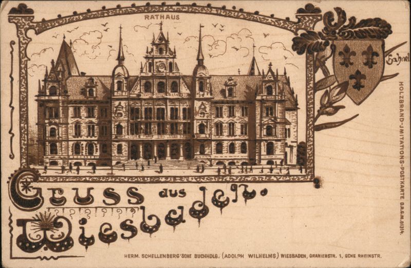Greetings from Wiesbaden (Gruss aus Wiesbaden) featuring the city hall (Rathaus). The design is a wood-burning imitation (Holzbrand-Imitations-Postkarte) with an ornate border and a coat of arms on the right.
