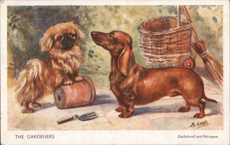 A Pekinese dog with its front paws resting on a garden pot stands beside a Dachshund dog in profile. Gardening tools, including a small hand rake and a wicker basket with a broom, are visible in a garden setting. The painting is signed 'M. GEAR' in the bottom right corner. |