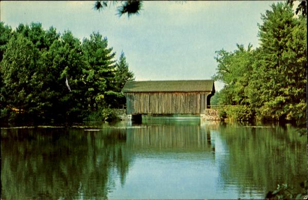 | Old Sturbridge Village at the junction of the Massachusetts Turnpike, U.S. 20 and State 15 and 131, is a recreated New England farming village of a century and a half ago. Horse and ox-drawn vehicles provide the only transportation within the 200 acre village, crossing this restored Vermont covered bridge. |