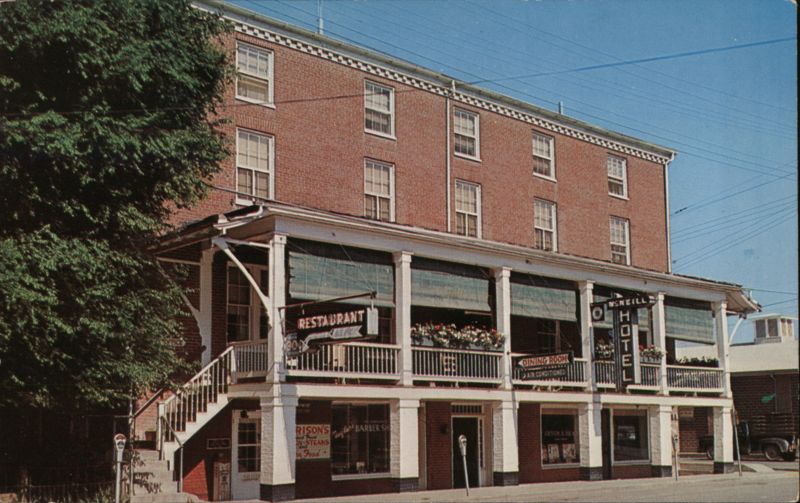 | A three-story red brick building with a two-level porch, housing the Hotel McNeill. The hotel features a restaurant, dining room, and coffee shop. According to the back, it is located on U. S. Route 220 and 55 and offers access to excellent hunting and fishing. |