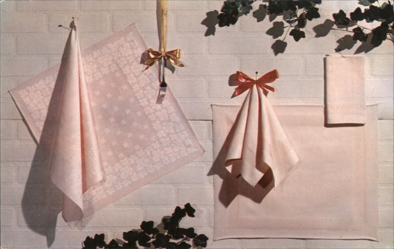 Napkins woven with 2-ply warps for greater strength. Retains fresh, smart appearance even after 150 washings. In either Ivy pattern or with satin band. Standard color is white, however either of these napkins is available in your choice of pastel colors. Sizes: 18" x 18", 20" x 20", 22" x 22", or to your specifications. A faithful reproduction of your crest woven into napkin on request. |