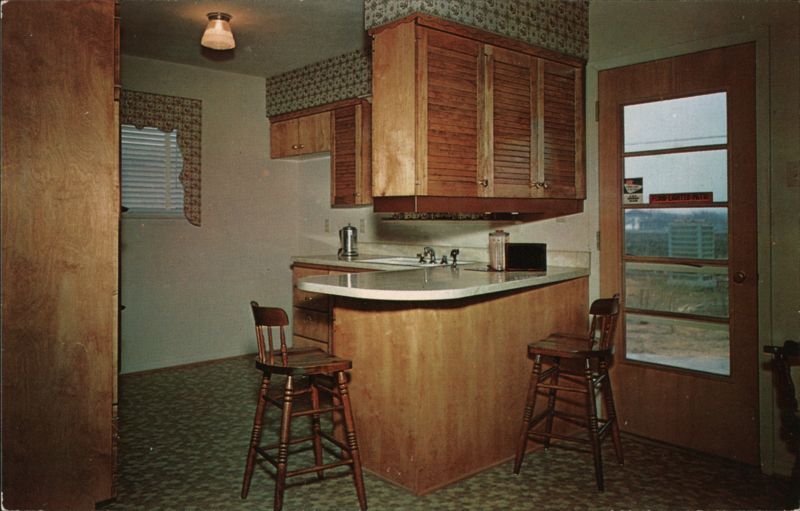 | An advertisement for Brandom Kitchens of Keene, Texas, showing a kitchen featuring their wooden cabinets with louvered doors, and a central island with a sink and seating for two. The back text notes cabinets are 'Quality Built by Master Craftsmen of Selected Clear Grain Birch' with choices of finishes and door styles. |