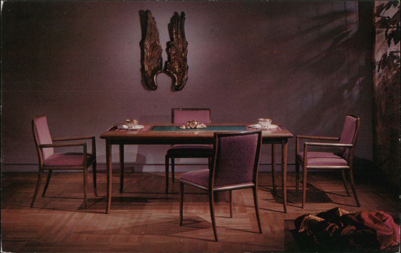 An advertisement for Tom Sinks Furniture Company in Cleveland, Ohio, showcasing a dining room set designed by T. H. Robsjohn-Gibbings for Widdicomb. The mid-century modern set includes a dining table and five chairs against a mauve wall with a gilded wall sculpture. |