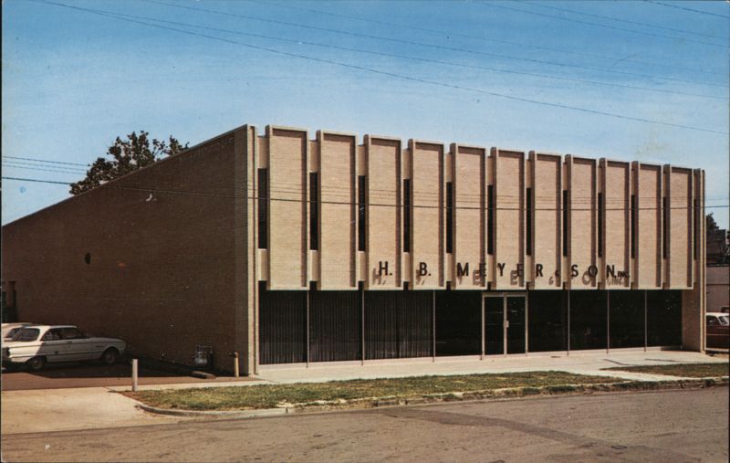 | Exterior view of the H. B. Meyer & Son, Inc. building, suppliers of quality controlled products for sanitation and maintenance, located at 1412 Pocahontas at S. Akard in Dallas, Texas. The building features mid-century modern architecture. |