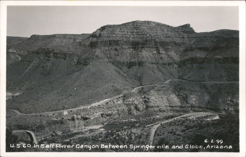 A wide, scenic view of a winding road through a large, arid canyon. A river and a bridge are visible at the bottom of the canyon.