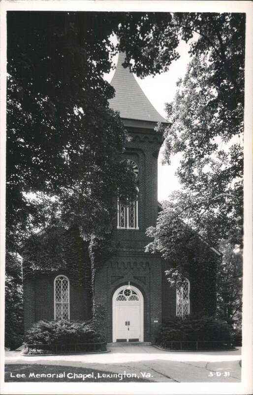 Frontal view of a brick chapel with a clock tower and steeple, framed by leafy trees. The chapel walls are partially covered in ivy.