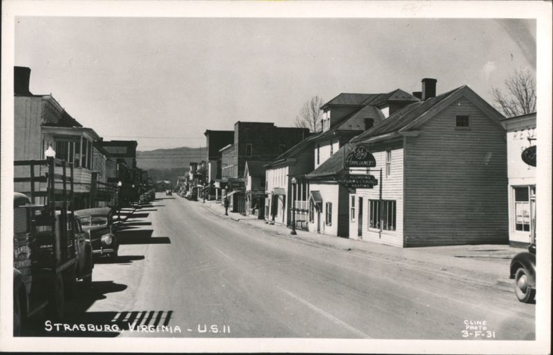 A view looking down a wide street with vintage cars parked on the left. Signs for GE Appliances and Funk & Crabill Plumbing & Heating are visible on a building to the right. Mountains are seen in the background.