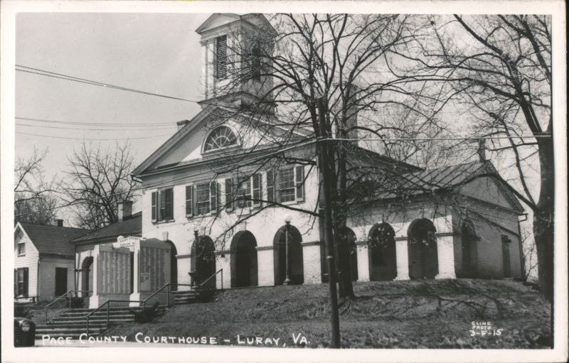 | Black and white view of the two-story classical revival style brick building, featuring a ground floor arcade, shuttered windows, a pedimented gable with a fanlight, and a square cupola. A large honor roll monument stands on the lawn in front of the main entrance steps. Bare trees are visible in the foreground. |