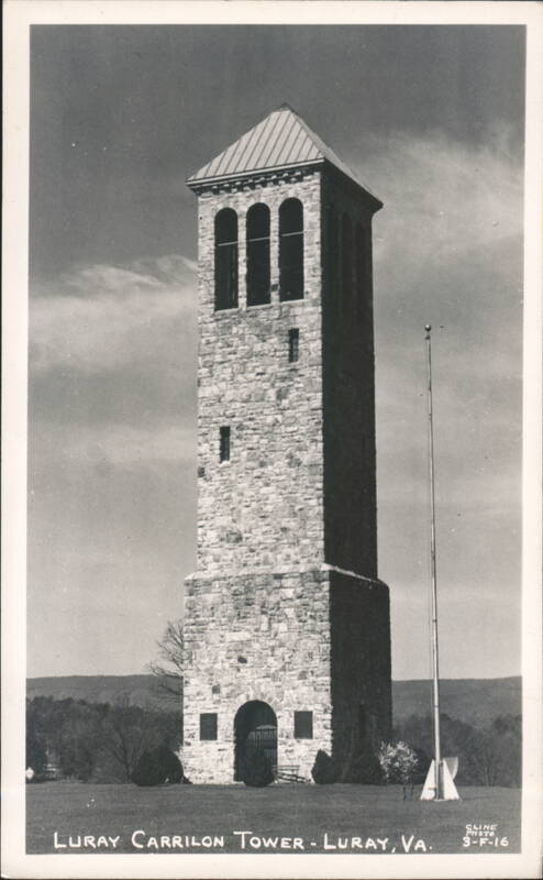Stone bell tower with a hip roof stands in a grassy field next to a flagpole. Hills and trees are visible in the background under a partly cloudy sky.