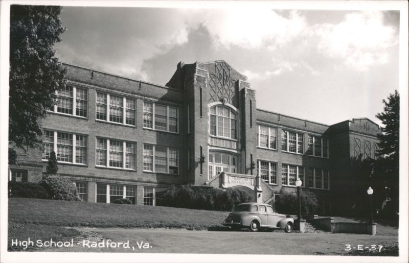 Exterior view of the large, three-story brick school building. The sign above the main arched entrance reads 'Radford High School'. Decorative brickwork is visible on the central tower.