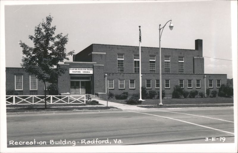 | Black and white real photo view of a two-story brick building with a one-story wing. A sign above the entrance reads "RADFORD RECREATION BUILDING RADFORD, VIRGINIA". A flagpole with an American flag, a street lamp, and a tree are in the front yard, which is partially enclosed by a white crossbuck fence. A bicycle is parked on the sidewalk near the entrance steps. |