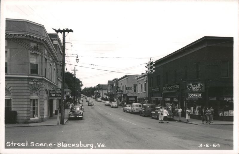 A black and white view of a downtown street lined with vintage automobiles from the late 1940s and early 1950s. On the left is the William Preston Hotel building, which also houses the Vogue Beauty Salon. On the right are signs for Corner Drugs (a Rexall store) and Rose's 5-10-25¢ Stores. Pedestrians walk along the sidewalks. |