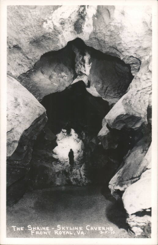 Black and white photograph looking down a cave passage towards a brightly lit area where a silhouetted figure stands. Large rock formations frame the view.