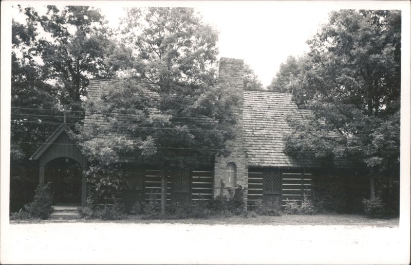| A rustic church or chapel constructed from logs with a wood shake roof. The building features a prominent stone chimney with a small, inset cross. A covered, gabled entryway on the left is also topped with a cross. The building is surrounded by dense trees. |