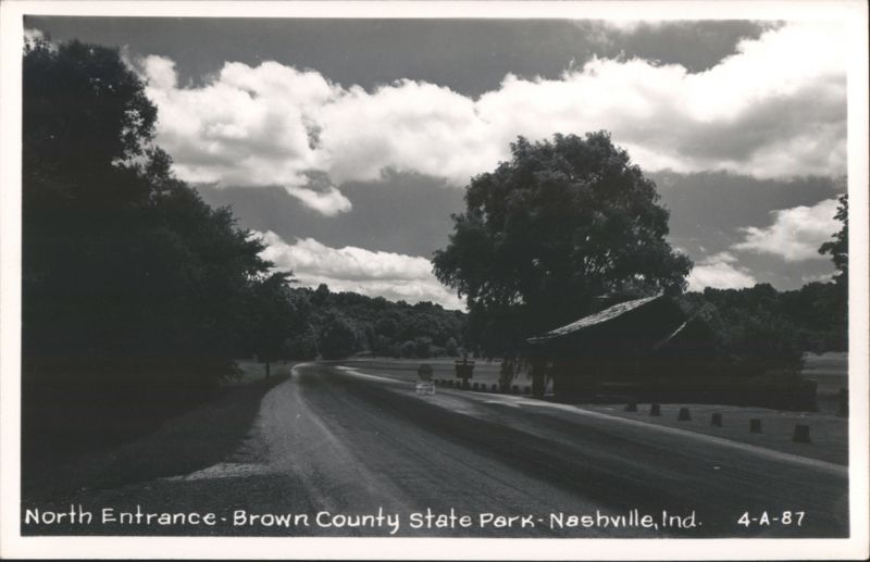 A view of the winding road leading to the park entrance. A small building or gatehouse with a wood shingle roof is visible on the right, surrounded by trees under a partly cloudy sky.